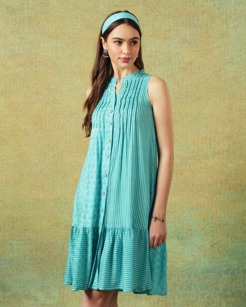 Teal Blue Block Print Dress Princess Line Cut with Stripes & Hand-Embroidered Pocket