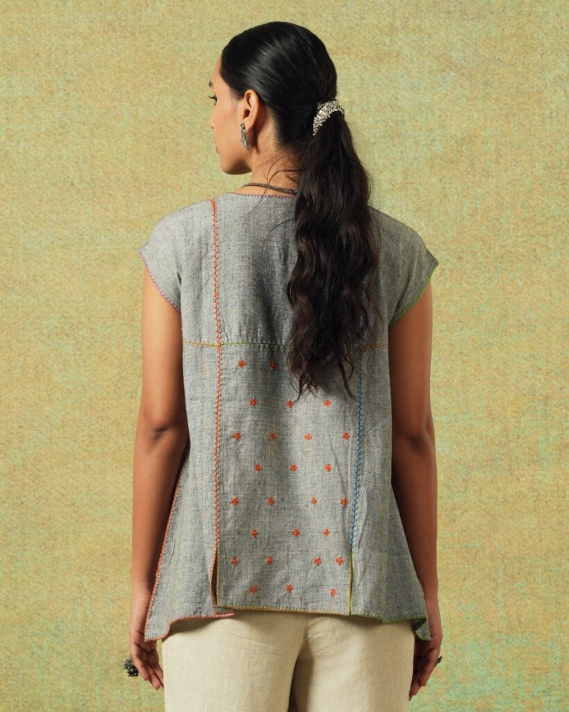 Sleeveless Top Dupion Silk Hand Embroidery Blue