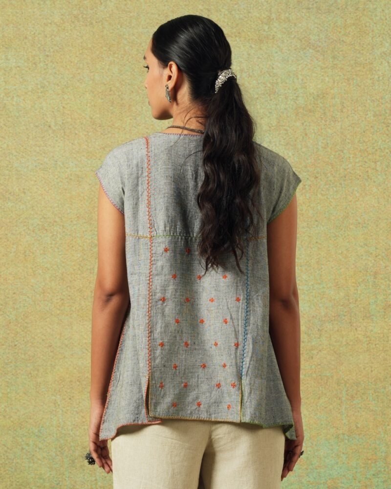 Patchwork Dress in Shades of Grey with Orange Pocket