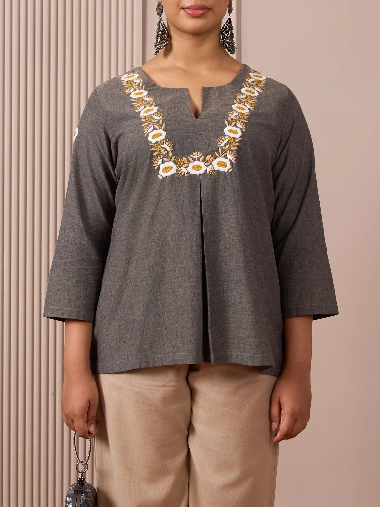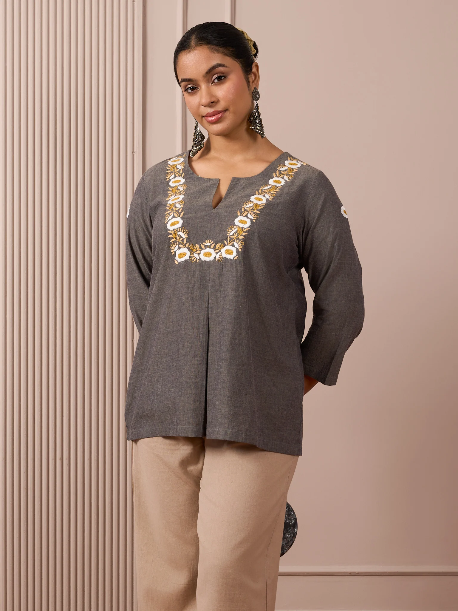 Meet your new everyday favorite: our Dark Grey Mangalagiri with White Flowers, finished with delicate hand embroidery. The refined Mangalagiri texture elevates the rich grey, while a softly structured front with a box pleat creates a relaxed, flattering drape. Thoughtfully designed for ease and movement, it pairs effortlessly with trousers or leggings for workdays or weekends.
