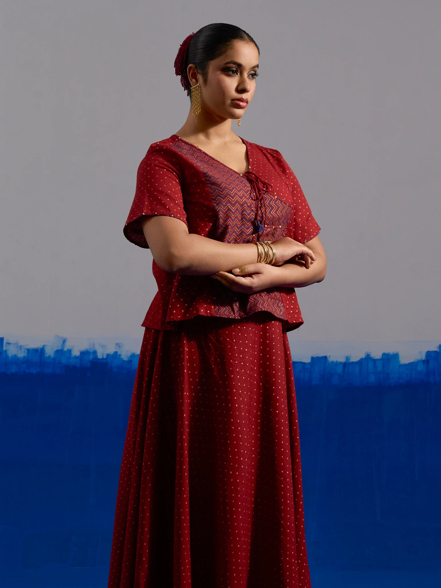 Coord Set Maroon Block Print with Zig-Zag Panel Top and Gold Dot Flared Skirt