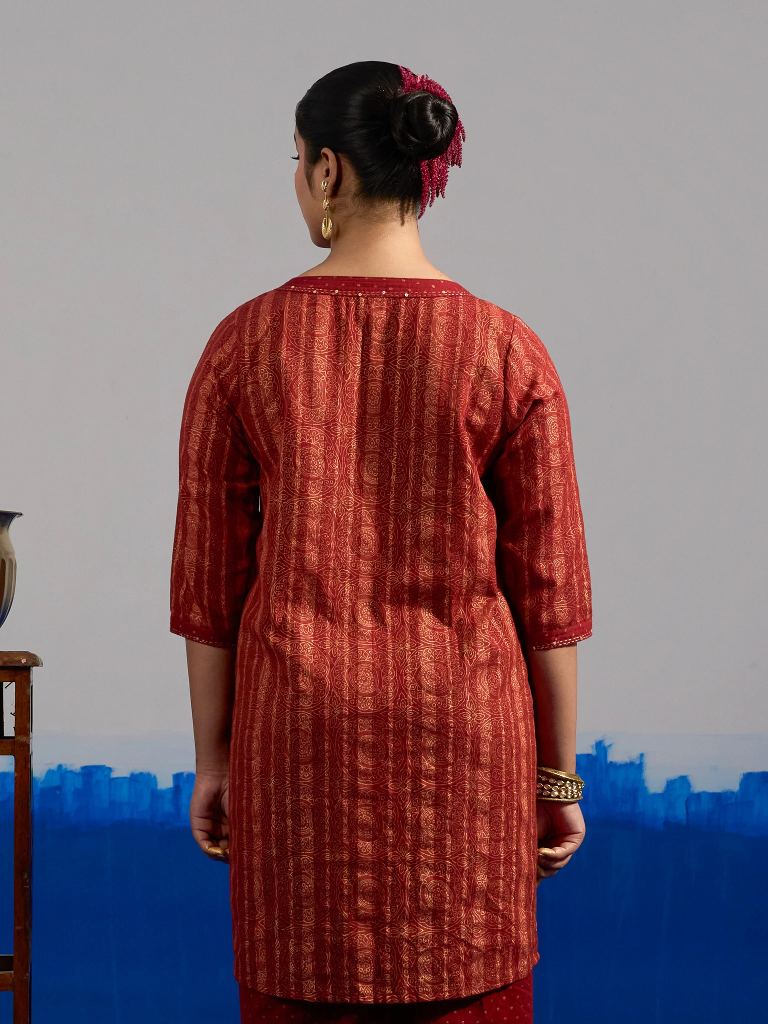 Coord Set Maroon Gold Dot Block Print with V-Neck Tunic and Flared Pants