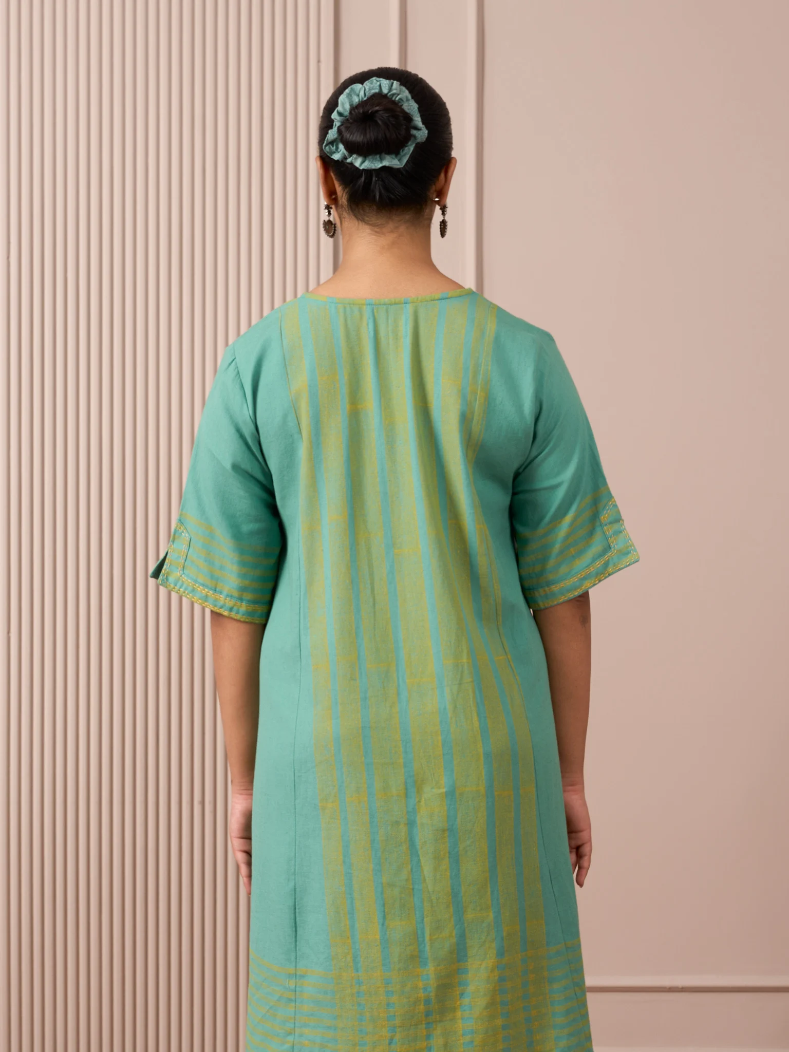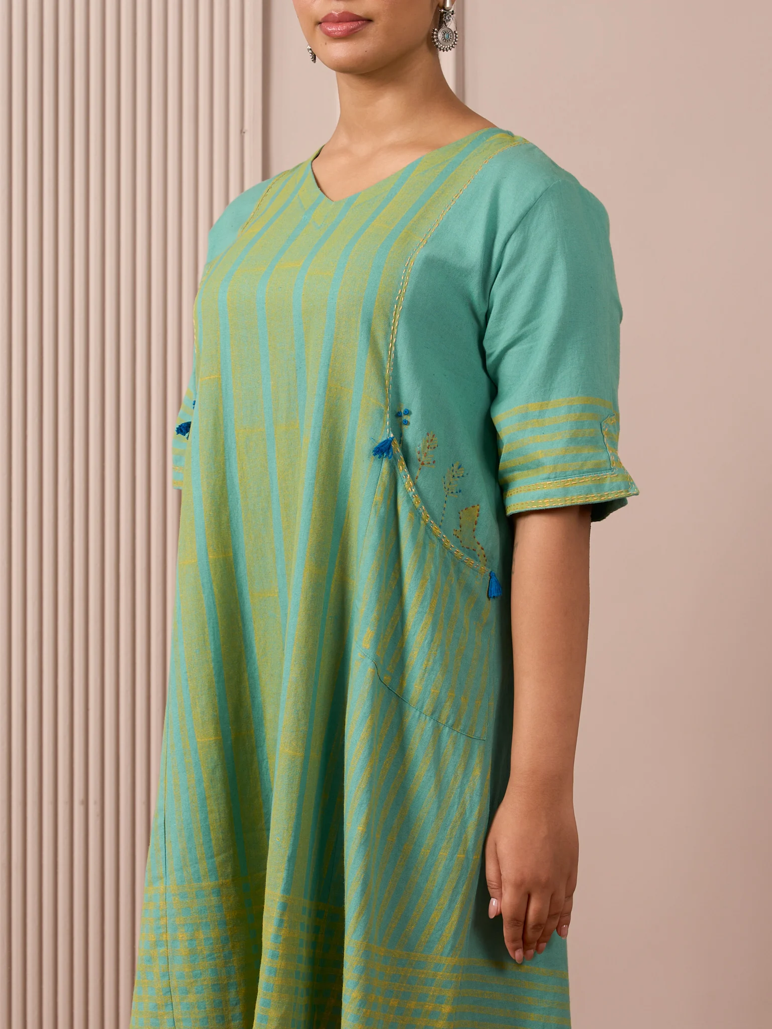 Meet the Teal Blue Block Print Dress—an above-the-knee, short-sleeved A-line in breathable cotton-flax. Princess-line tailoring skims the body for a flattering fit, while soft stripes and a gentle V-neckline lengthen the silhouette. Its multi-layer block print brings depth to the teal blue hue. A hand-embroidered pocket adds artisanal charm. Light, easy, and versatile, it moves from workdays to weekends with sandals or sneakers.